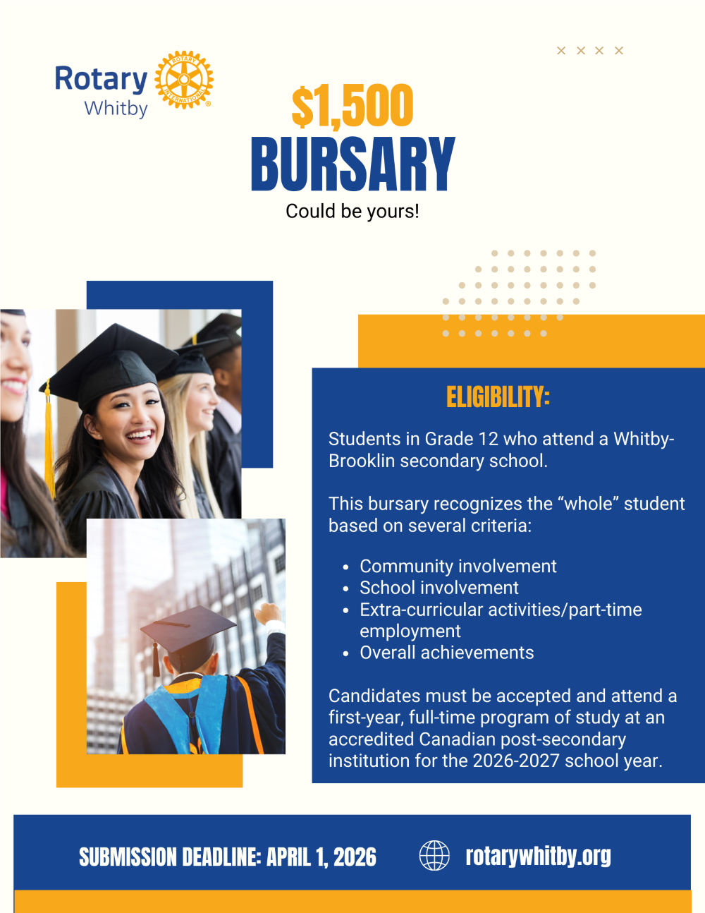 $1500 could be yours! The Whitby Rotary Club recognizes results, and is offering a $1,500 bursary to Whitby and Brooklin graduating secondary school students who are planning to attend an accredited Canadian College or University.