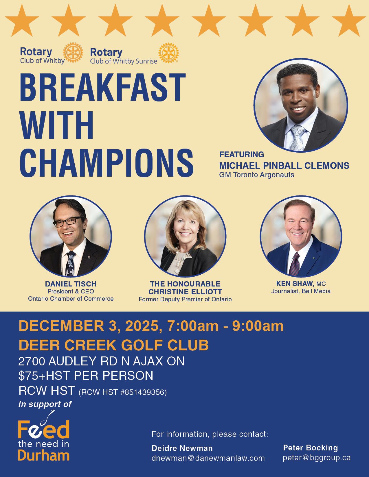 Concert to Feed The Need in Durham![]() We are proud to announce the 5th annual Concert to Feed the Need in Durham! The concert is proudly presented by Rotary Clubs in Durham Region. For Ticket sales visit ftndconcert.ca A presentation of 8 Durham Rotary Clubs, this year's concert will be staged at new Biltmore Theatre in Oshawa -- where musicians from across the Durham Region will be gathering to help feed their neighbours in need. We have another great line-up of award-winning performers from genres across the musical spectrum. It happens, Saturday, December 10th at 2 pm. |